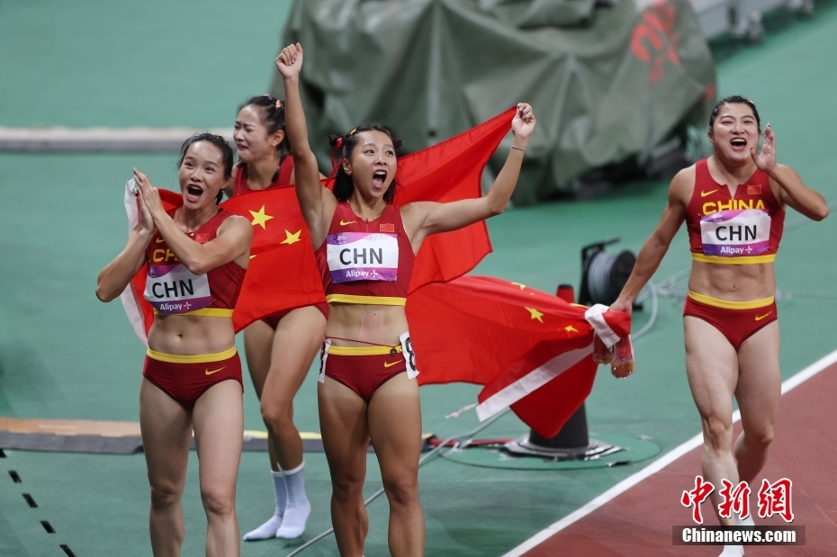 女子4x100米接力决赛中国队选手韦永丽、梁小静、葛曼棋、袁琦琦(从左至右)以43秒39夺得冠军