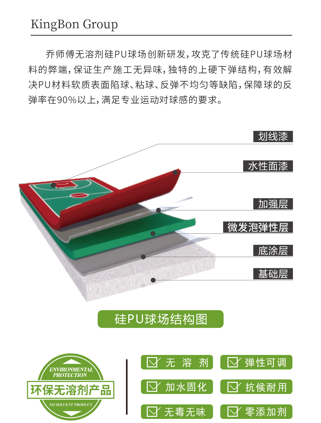 无溶剂PU球场创新研发,攻克了传统硅PU球场材料的弊端,保证生产施工无异味,独特的上硬下弹结构,有效解决PU材料软质表面陷球、粘球、反弹不均匀等缺陷,保障球的反弹率在90%以上,满足专业运动对球感的要求