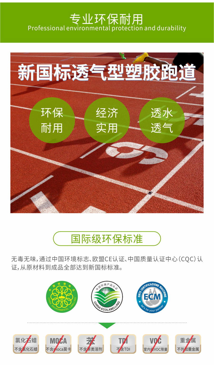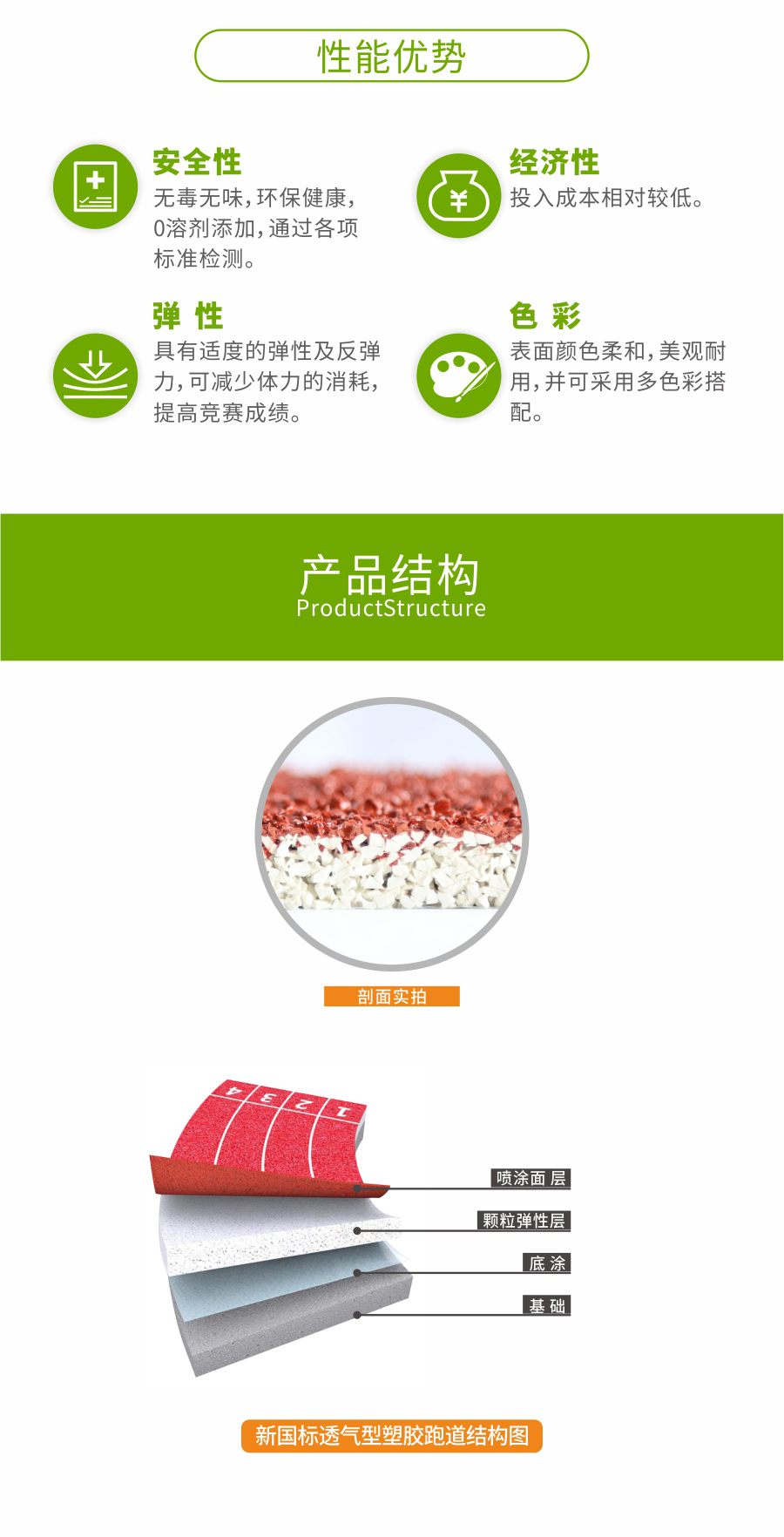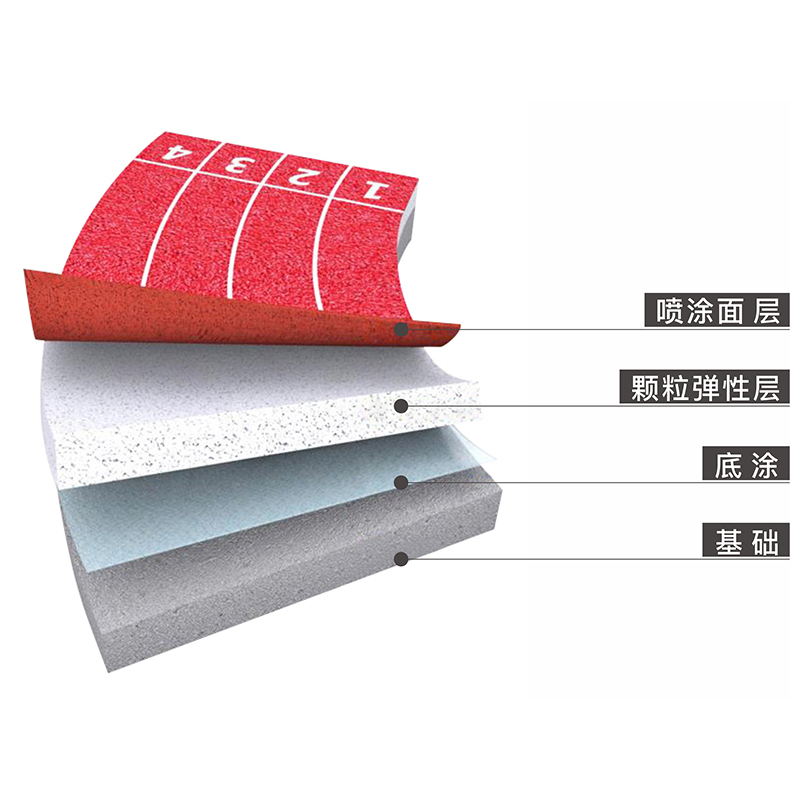 透气型塑胶跑道是由橡胶黑颗粒为底层,聚氨颗粒与塑胶浆为面层铺设组成的高性能塑胶结构。具有使用寿命长、综合性能适中、施工快捷等优点,它经济实惠、价格低廉,而且不会有鼓泡现象发生,同时也减少了地基经费的投入。